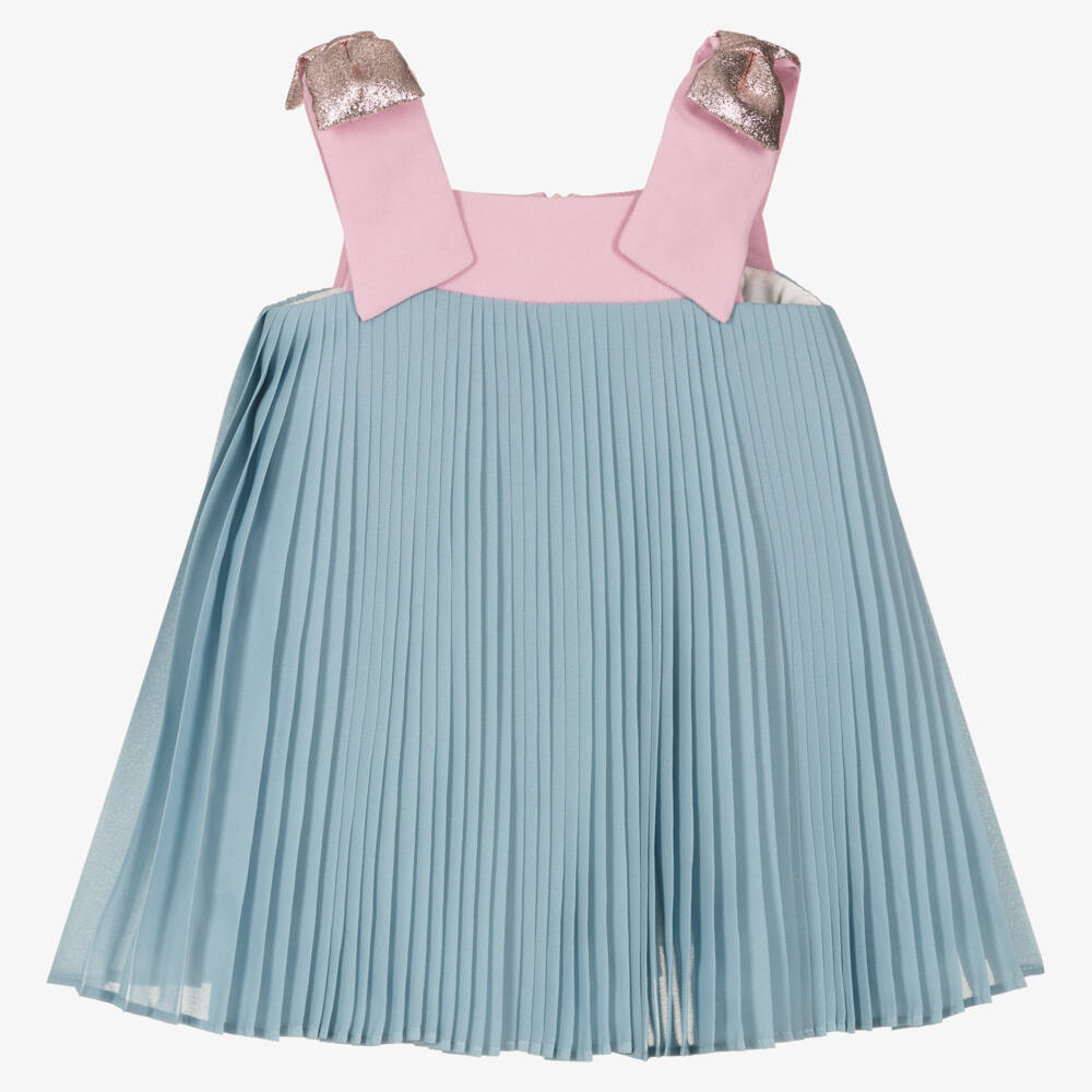 Baby girls special occasion dress from Hucklebones London, exquisitely pleated in sheer blue chiffon. An elegant trapeze design with a beautiful flared shape, it has an pink crêpe empire neckline with shimmering pink lamé bows on the shoulders. The dress is lined in lightweight cotton with a tulle layer for extra volume and fastens with a concealed zip on the back. It comes with matching lined knickers that are gently elasticated for comfort.