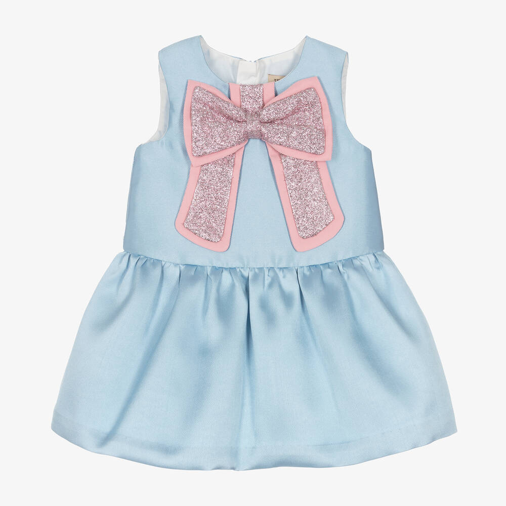 Exclusive to Childrensalon, a pretty blue dress for baby girls by Hucklebones London, made in soft, mid-weight satin twill. This cute dress has a large bow on the front in contrasting pink fabric with metallic pink detail. It is lined in lightweight cotton for comfort and fastens neatly on the back with a concealed zip. Ideal for a special occasion, it comes with matching lined knickers, which are gently elasticated for comfort.