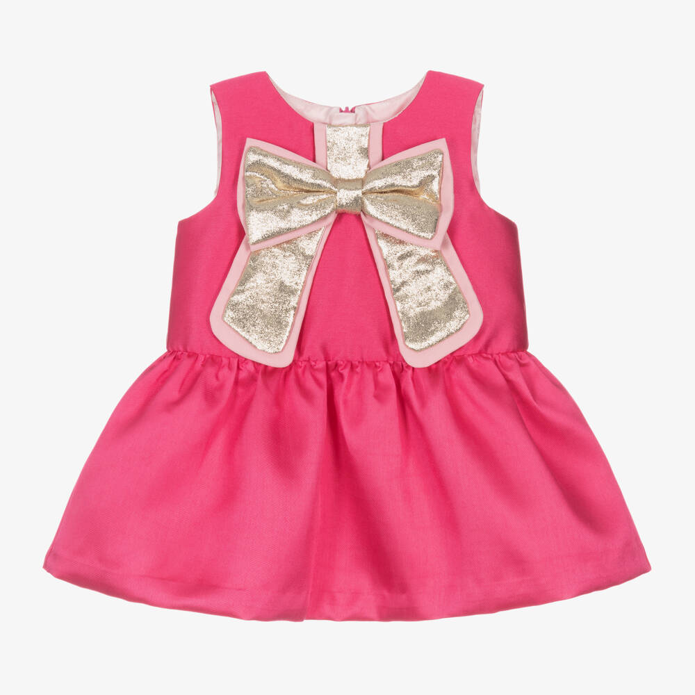 Fuchsia pink dress for baby girls by Hucklebones London, with a large gold bow on the front. Ideal for a special occasion, this cute twill dress is lined for comfort and comes with matching knickers to complete the look.
