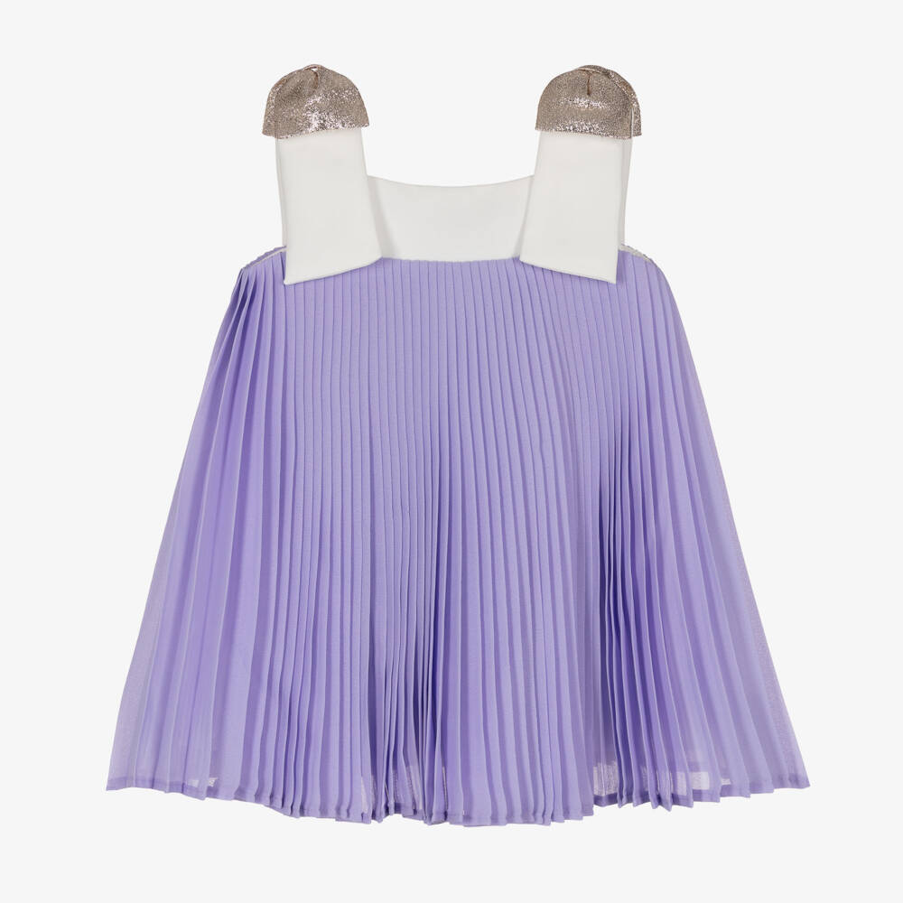 Gorgeous lilac purple dress for baby girls by Hucklebones London, an exclusive to Childrensalon. So lovely for special occasions, it is made in flowy crêpe chiffon, beautifully pleated in a trapeze silhouette with soft netting underneath for a slightly voluminous shape. The ivory trims give it an eye-catching contrast with a shimmery silver bow on each shoulder strap for a sophisticated finish. A pair of matching bloomers complete the look. Both are fully lined in soft cotton voile for comfort.