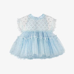 Exclusive to Childrensalon, a pretty blue dress for girls by Hucklebones London, made in soft, mid-weight satin twill. Ideal for a special occasion, this lovely dress has a stylish A-line shape and a large bow on the front made from contrasting pink fabric and metallic pink details. It is lined in lightweight satin for comfort and fastens neatly on the back with a concealed zip.