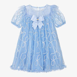 Exclusive to Childrensaon, a gorgeous pale blue special occasion dress for girls by Hucklebones London, made in soft, mid-weight satin twill. This elegant, sleeveless design has a deep ruffle trim on the chest and an eye-catching, oversized, glittery gold bow on the back. It has a discreet, concealed zip fastening and a stylish dipped hem on the back, with a soft satin lining for comfort.