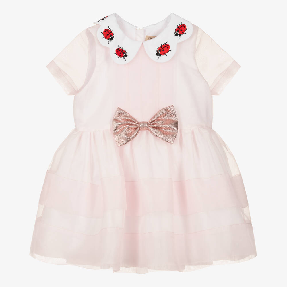 Lovely pale pink organza dress for girls by Hucklebones London, lined with soft lightweight cotton. This statement dress has cute red ladybirds embroidered on the scalloped collar and a glittery rose gold bow on the front. It has sheer sleeves and underlayers of soft tulle on the skirt for added volume.