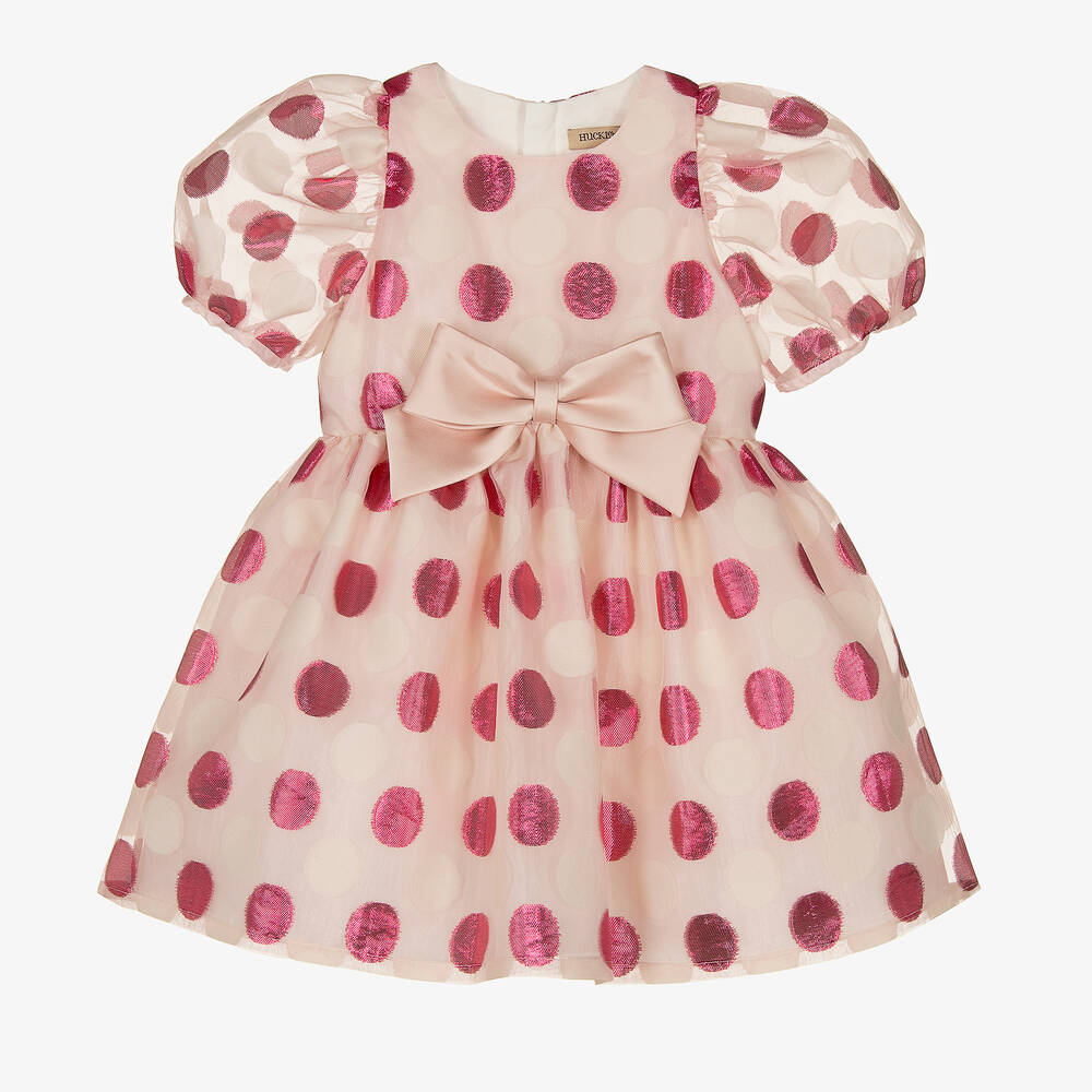 A pretty pink dress for girls by British Brand Hucklebones London, made in soft and lightweight organza. Ideal for special occasions, this lovely round neck dress is designed in a timeless polka dot print, incorporating metallic pink dots which shimmer beautifully. The sheer puffed sleeves gather gently on the shoulder and the waist is trimmed with a large satin bow. Fastening with a concealed zip on the back, it has a soft lining and a tulle underskirt for added volume.