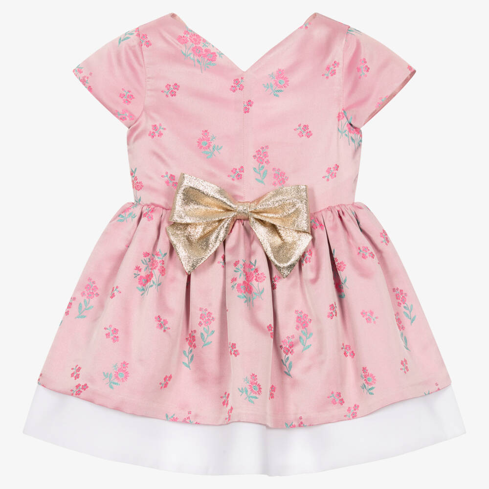 Gorgeous pink special occasion dress for girls by Hucklebones London, made in luxurious satin jacquard with a pink and green floral pattern. A classic style, it has capped sleeves and a lovely sweetheart neckline with a deep scalloped V on the back. The full gathered skirt is trimmed with white crêpe on the hem and a sparkling gold lamé bow on the waistline completes the look. The dress is lined in lightweight satin with tulle trim for added volume and fastens with a concealed zip on the back.