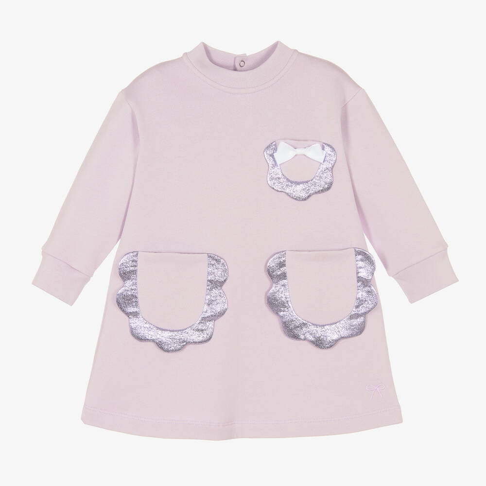 Lilac purple cotton sweatshirt dress for girls by Hucklebones London. Made in soft mid-weight jersey, it has a cosy fleecy inside and gently ribbed trims. Easy to wear, this long-sleeved piece has three pockets on the front, lined with silky fabric. The metallic purple trims create a petal effect and the white grosgrain bow on the chest adds a pretty finishing touch.