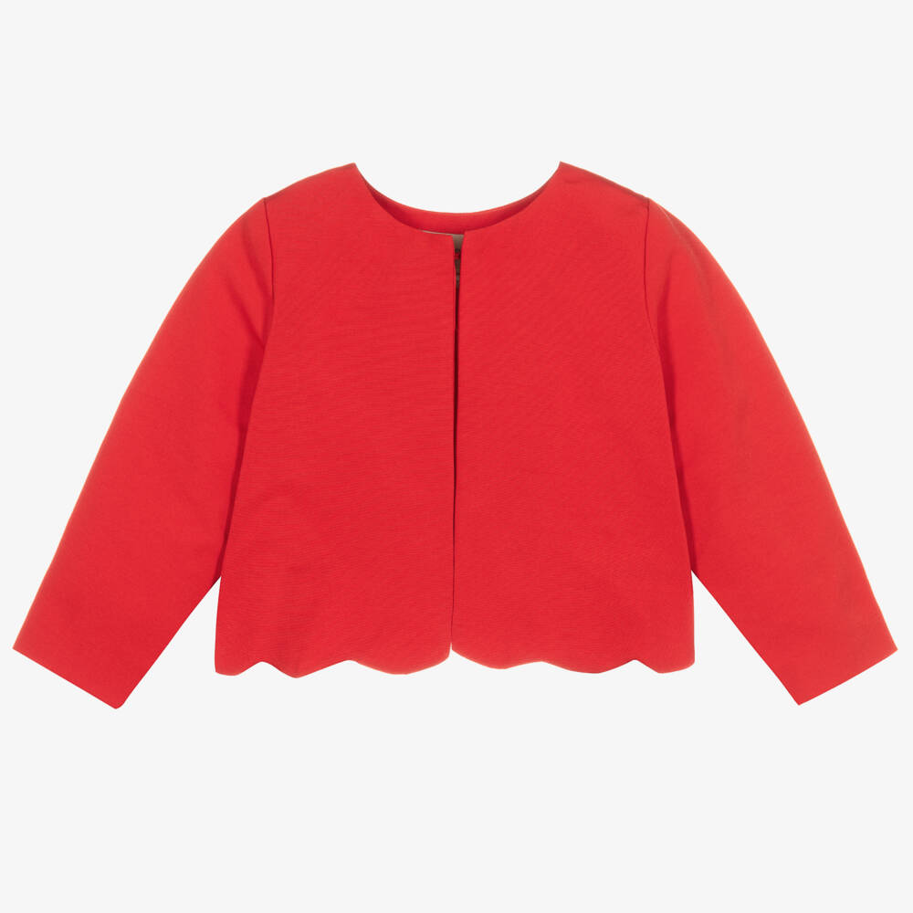 Smart red jacket for girls by Hucklebones London, made in cotton-blend satin twill. An elegant collarless design, it has a shorter length and pretty scalloped hem with a fixed bow on the back. It is lined in lightweight satin and has a single hook and bar fastening at the neck.