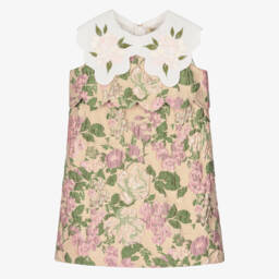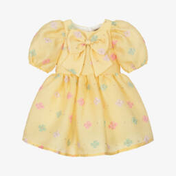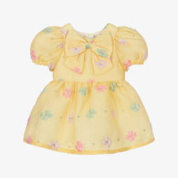 Exclusive to Childrensalon, a sky blue shift dress by Hucklebones London. Made in soft woven twill with a slight sheen, this lovely design has a contrast white ruffle bib and a blue Peter Pan collar and bow appliqué. Fully lined in shiny satin, it fastens on the back with a concealed zip.