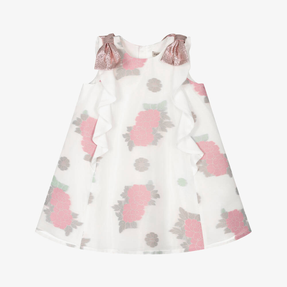 Lovely white special occasion dress for girls by British brand Hucklebones London, exclusive to Childrensalon. Made in soft organza with a sheen, it is patterned with pink and green jacquard roses. There are eye-catching, glittery pink bows on the shoulders and crêpe ruffles cascading over the shoulders on both the front and back. It has underlayers of tulle for volume and a lightweight cotton voile lining for comfort. There is a concealed zip fastening around the back.