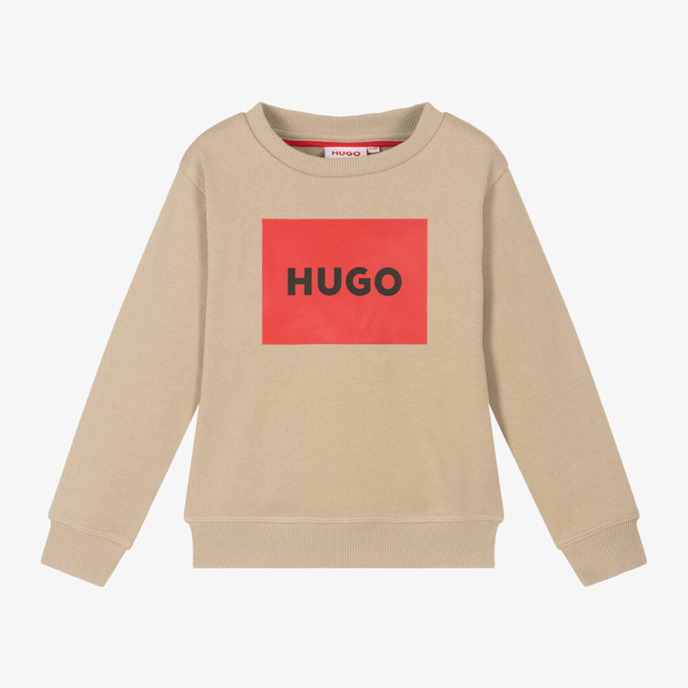 Cool and casual beige crew neck sweatshirt for boys by German label HUGO. Comfortable and easy to wear, it is made in cotton-blend jersey with a soft and fleecy inside. The brand's signature logo stands out in red and black on the front.