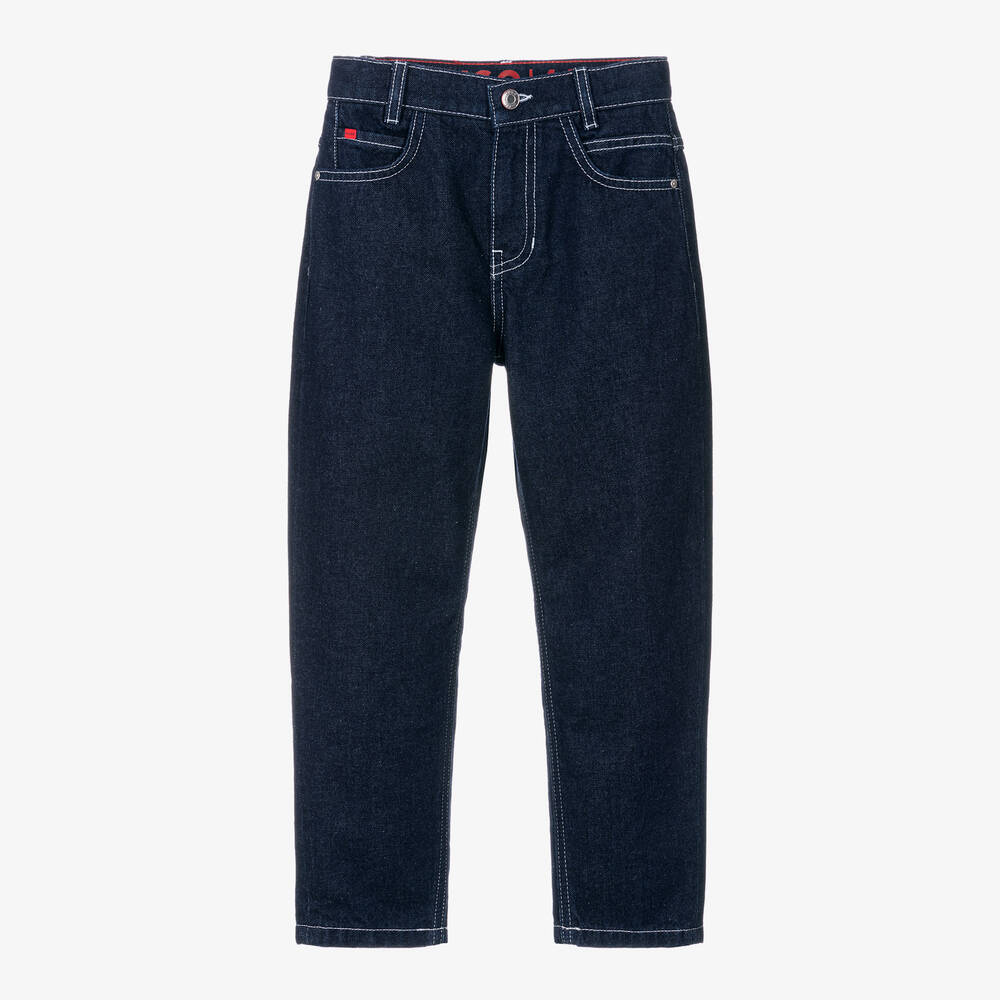 Dark blue loose fitting jeans for boys by HUGO, made in non-stretch denim. With classic five-pocket styling, they have stand-out contrast white stitching for an updated look. They fasten with a button and zip and have a useful adjustable waist for a comfortable fit. The HUGO 446 style name is printed inside the back of the waistband in red. There is a black and red logo badge on the back and a red metal logo rivet on the coin pocket.