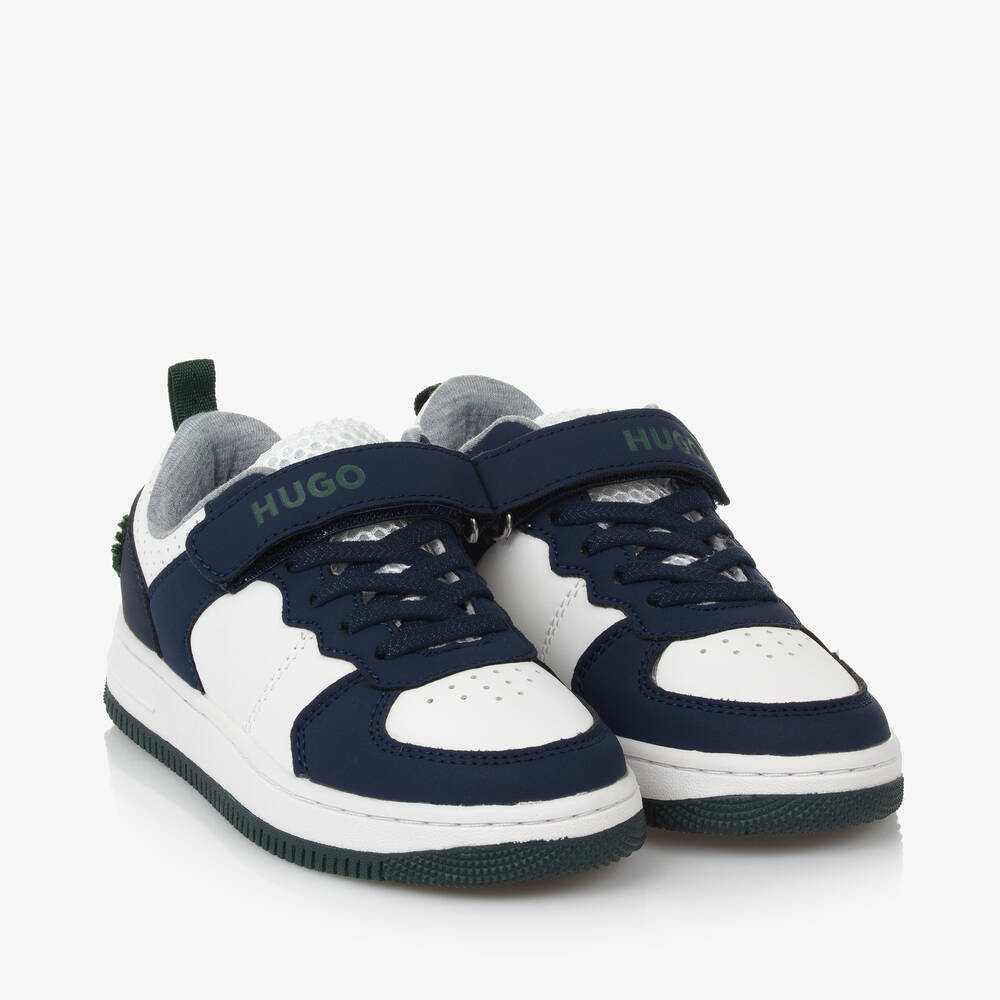 Cool blue trainers for boys by HUGO, as seen in the adult collection. Made in soft faux leather with sporty perforations, they have signature logo detailing printed on the velcro strap and appliquéd on the back in forest green bouclé. The soft jersey lining and padded insole provide ultimate comfort to everyday. Set on a chunky sole, they have great grip due to their deep tread design.