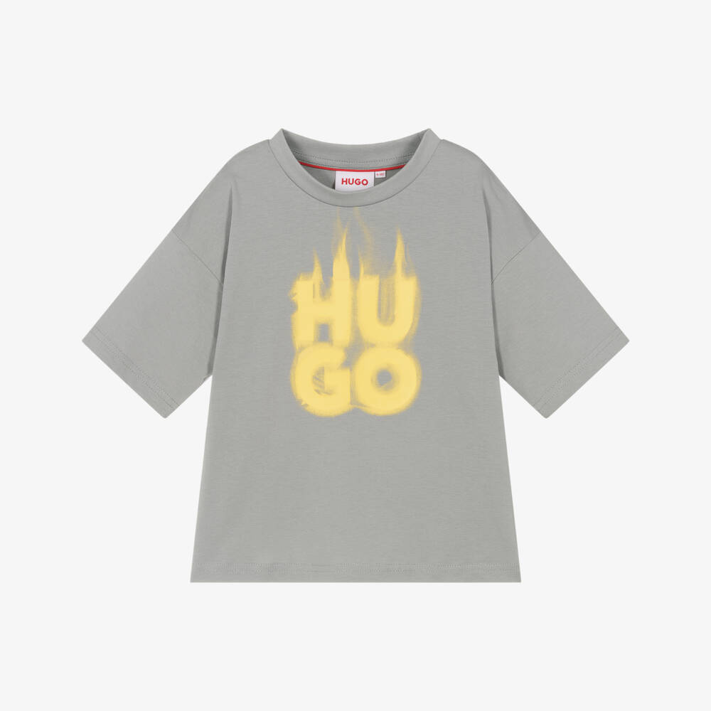 Grey T-shirt for boys by HUGO, made in soft cotton jersey. This casual top has a boxy style with dropped shoulders and a ribbed crew neck. It features a rubberised yellow flame logo on the front for an eye-catching branded finish.