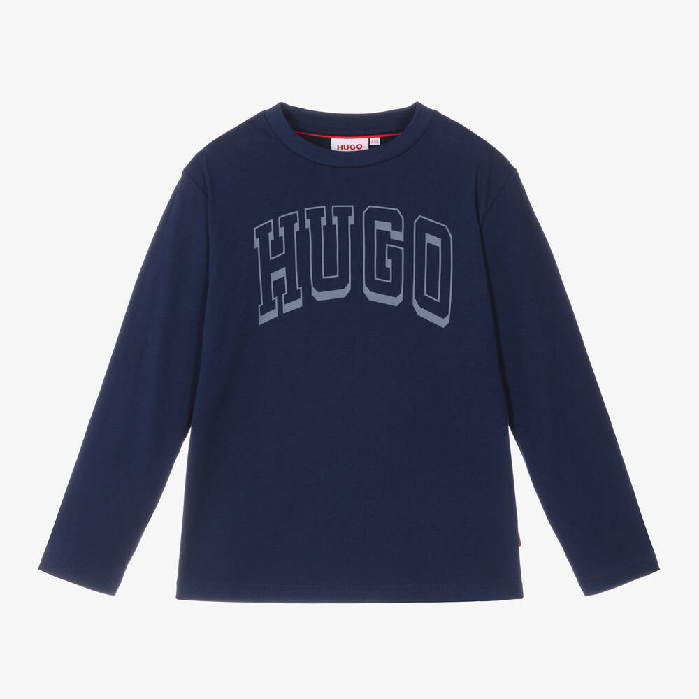 Navy blue long-sleeved top for boys by HUGO, made in soft, lightweight organic cotton jersey. Cool and casual, it has a varsity style logo printed on the front and a classic ribbed crew neck. There is a small red and black logo tab on one side seam for a subtle branded finish.