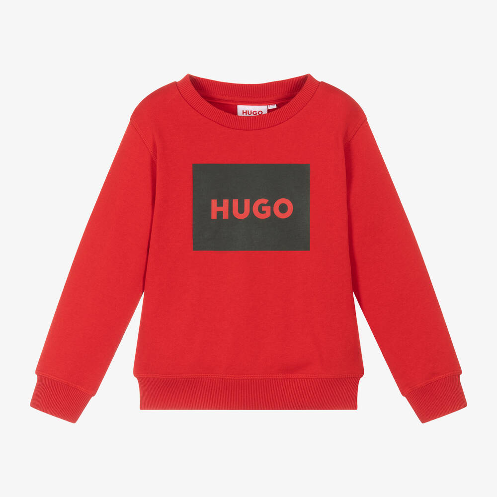 Cool and casual red crew neck sweatshirt for boys by German label HUGO. Comfortable and easy to wear, it is made in cotton-blend jersey with a soft and fleecy inside. The brand's signature logo stands out in black and red on the front.