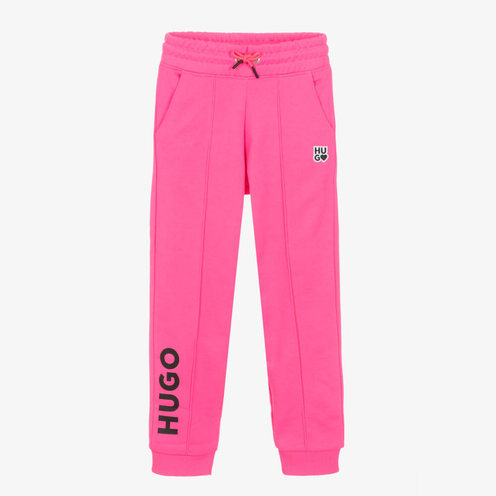 Pink joggers for girls by HUGO, made in soft, mid-weight cotton jersey. With stylish simplicity, these fun joggers have stitched seam detailing on the legs and an embroidered logo appliqué on the front. There is a bold black logo print on one leg and a comfortable drawstring waist for a perfect fit.