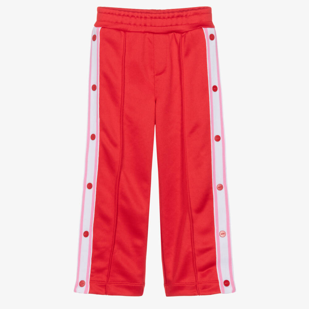 Casual red track joggers for girls by HUGO, made in silky soft jersey with stitched creases. They have pink striped taping down the sides, fastening with logo-embossed ivory poppers for added retro influence. The elasticated waistband, and single back pocket finish the look.