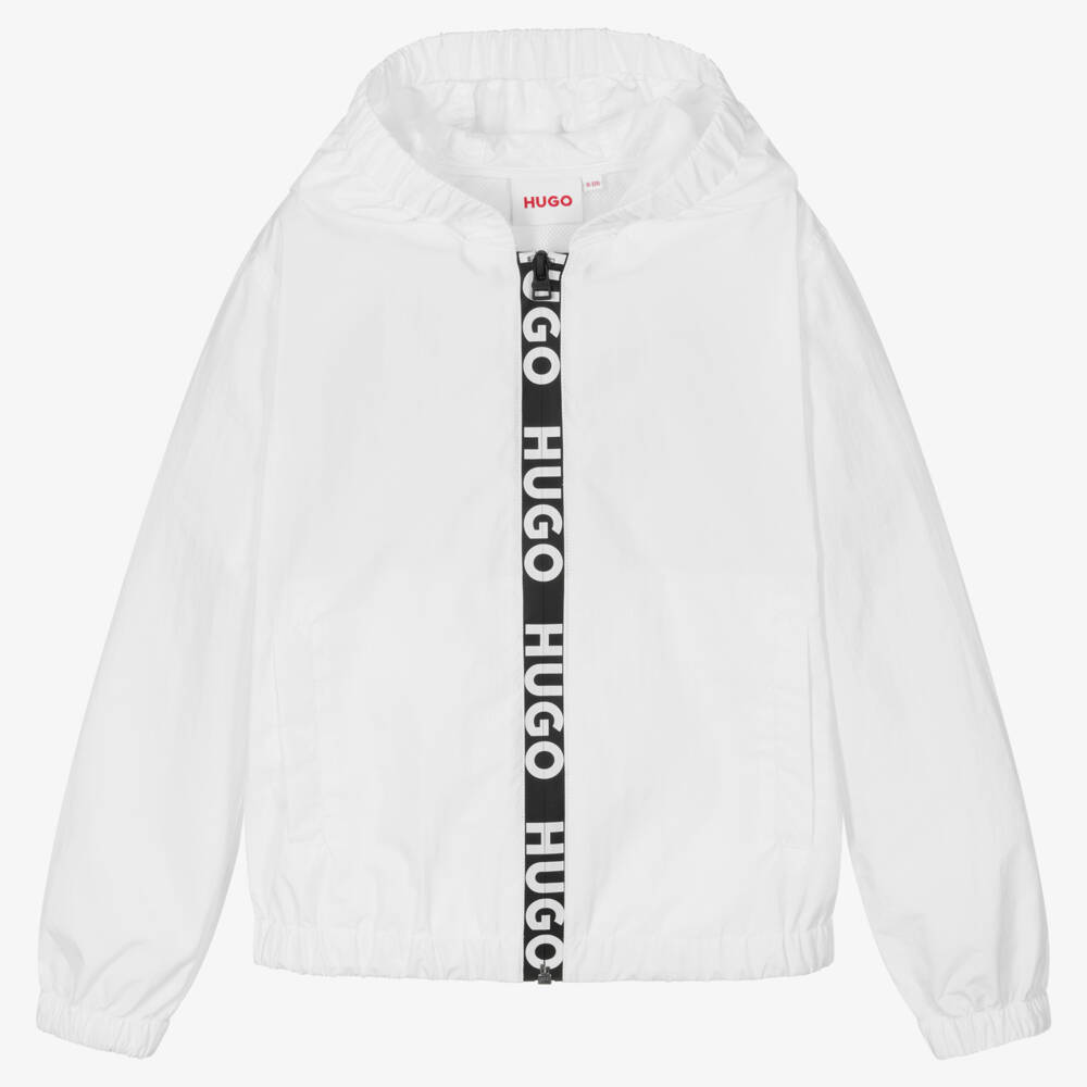 White hooded windbreaker jacket for girls by HUGO, made in soft, smooth nylon with a slight crinkled effect. There are front pockets and the jacket has an eye-catching black and white logo tape trim on the front-fastening zip. For an added branded touch, there is a black embroidered logo on the back. The upper back of the jacket has a breathable mesh lining, which forms the centre of the logo letters on the back.