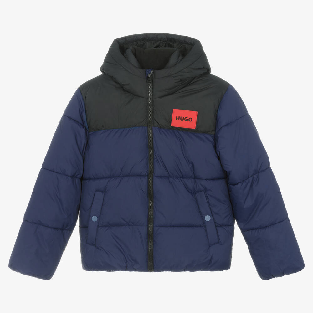 Blue and black puffer jacket for teen boys by HUGO, with a distinctive rubberised logo patch on the chest in the brand's signature red. Warmly padded, it is made in a silky smooth fabric, with a fleecy neck lining and a large protective hood. Fastening on the front with an exposed black zip, it has fleece-lined pockets, with logo-embossed popper fastenings, for that extra branded touch. There is a useful, internal velcro fastening slip pocket for securing small belongings.