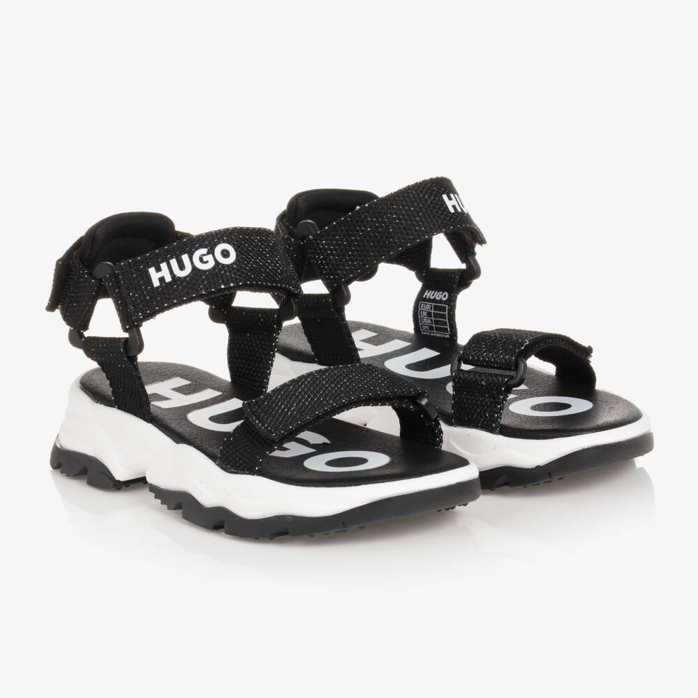 Black and white sandals for teen girls from streetwear brand HUGO, with a bold white logo print. In a cool monochromatic design, these textile sandals have subtle white interwoven specks, with a chunky white mid-sole for stylish wear. The useful velcro strap fastenings add functionality to the look. They are comfortably finished with a padded ankle support, a branded faux leather insole, and a grippy rubber outsole.