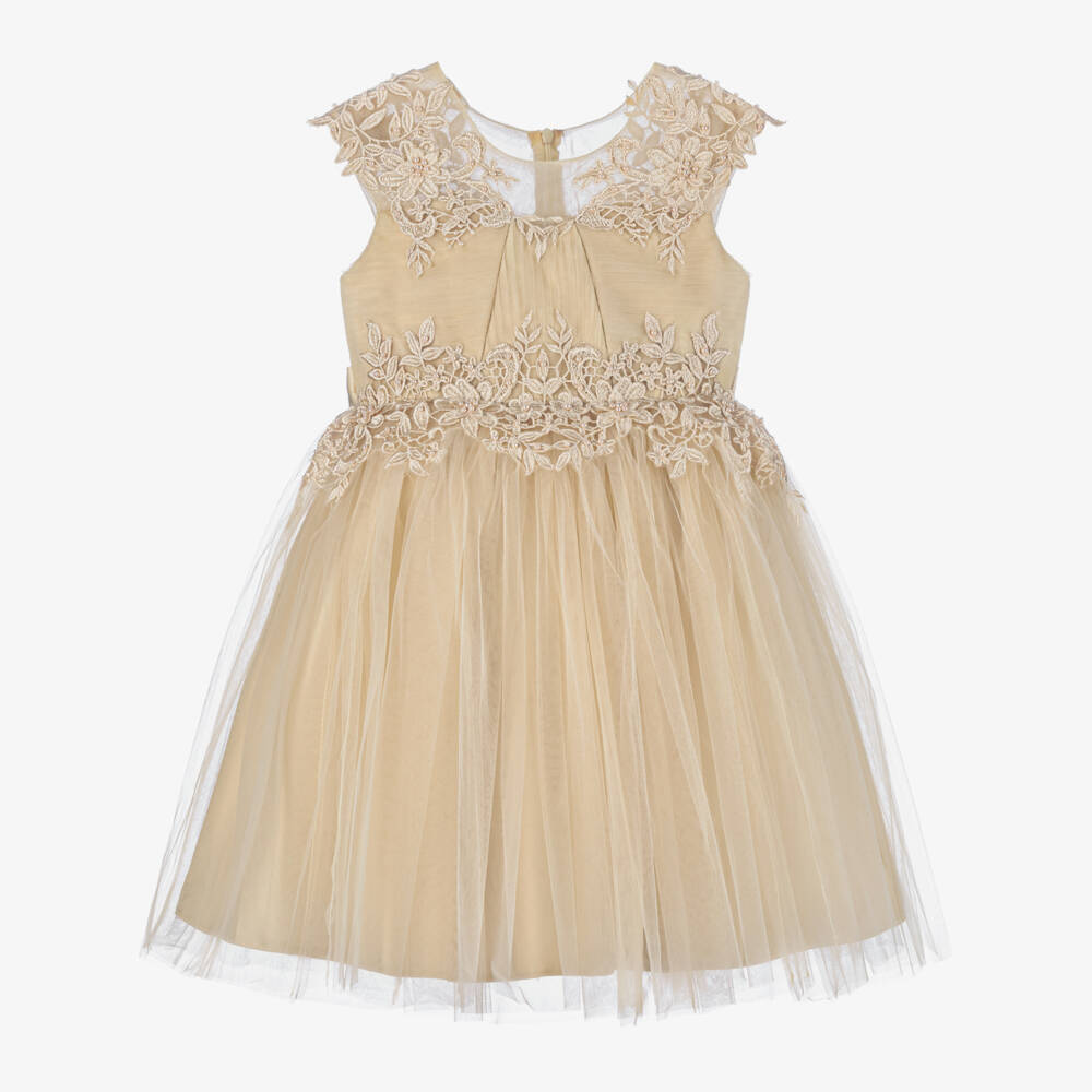 A golden beige dress for girls by iAMe, draped in layers of voluminous tulle. Charming for special occasions, the pin-tucked bodice has a sheer neckline and floral embroidery with shiny faux pearls. A zip fastens discreetly on the back and a sash belt ties neatly into a bow on the waist. This dress is lined in lightweight voile with netting to maintain it's shape.