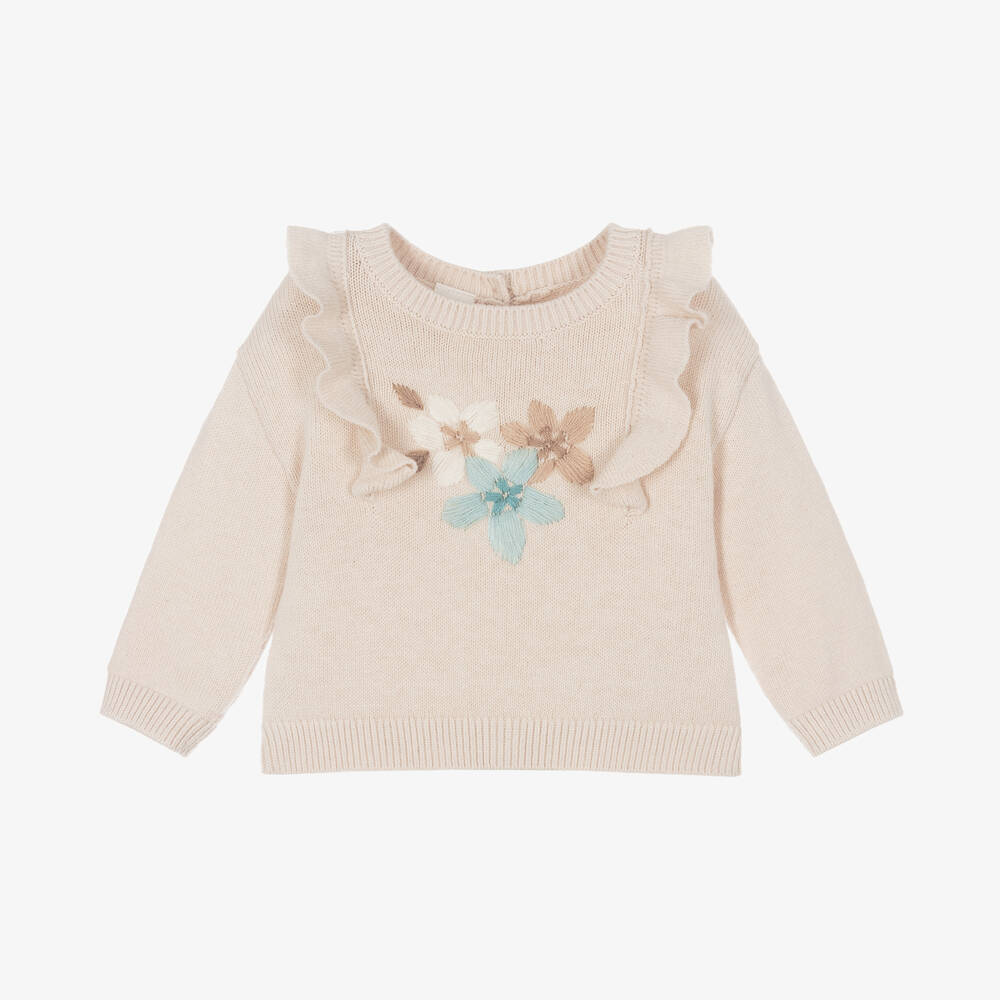 Super sweet, this pale beige long-sleeved jumper for baby girls is by iDO Mini. Knitted in a soft wool and cotton blend, it is embroidered with delightful blue, ivory, and brown flowers on the chest. There are charming frills over the shoulders and pearlescent button fastenings on the back.