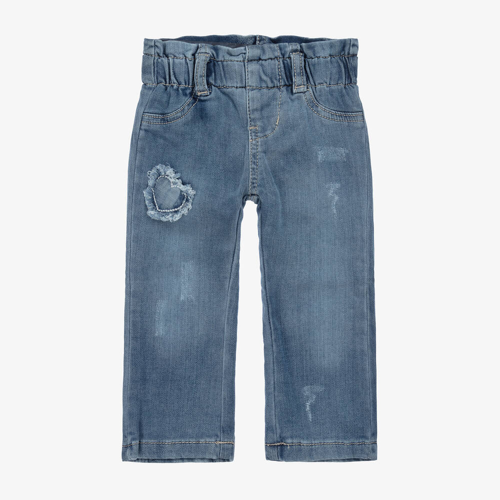 Blue stone-washed jeans for baby girls by iDO Mini, made from soft cotton jersey denim. Great for casual looks, they have distressed detailing and an appliqué heart patch on one leg. There are two patch pockets on the back, one of which is trimmed with a rubberised heart motif. They have a straight leg fit and a paper-bag-style waistband with plenty of stretch.
