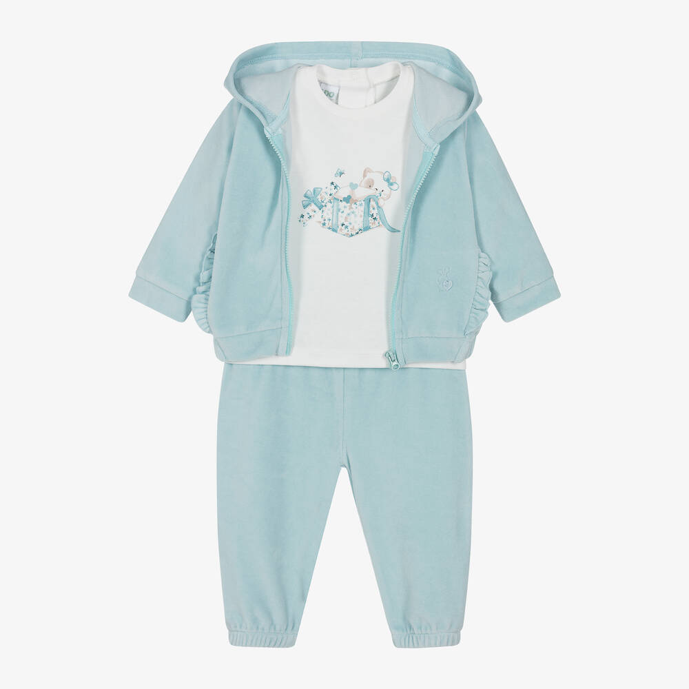 A lovely aqua blue cotton tracksuit set for baby girls by iDO Mini. Made from super soft velour, the zip-up hoodie has pretty frilled detailing and a tonal embroidered bunny rabbit motif for a sweet finish. The coordinating joggers have a delightful bow trim on the comfortable elasticated waist. Printed with a cute 'cate opening a present' design on the chest with subtle shimmery details, the white long-sleeved jersey top fastens with poppers on the back.