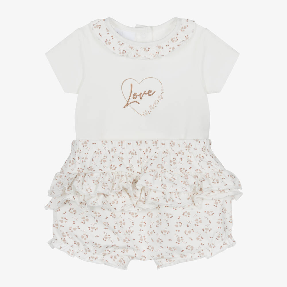Sweet ivory shorts set for baby girls by iDO Mini, made from super soft cotton jersey. The short-sleeved T-shirt has a heart design with an embroidered 'Love' slogan on the front and fastens with poppers on the back. The ruffled collar matches the frilly elasticated shorts, patterned in a beige heart print for a cute look.