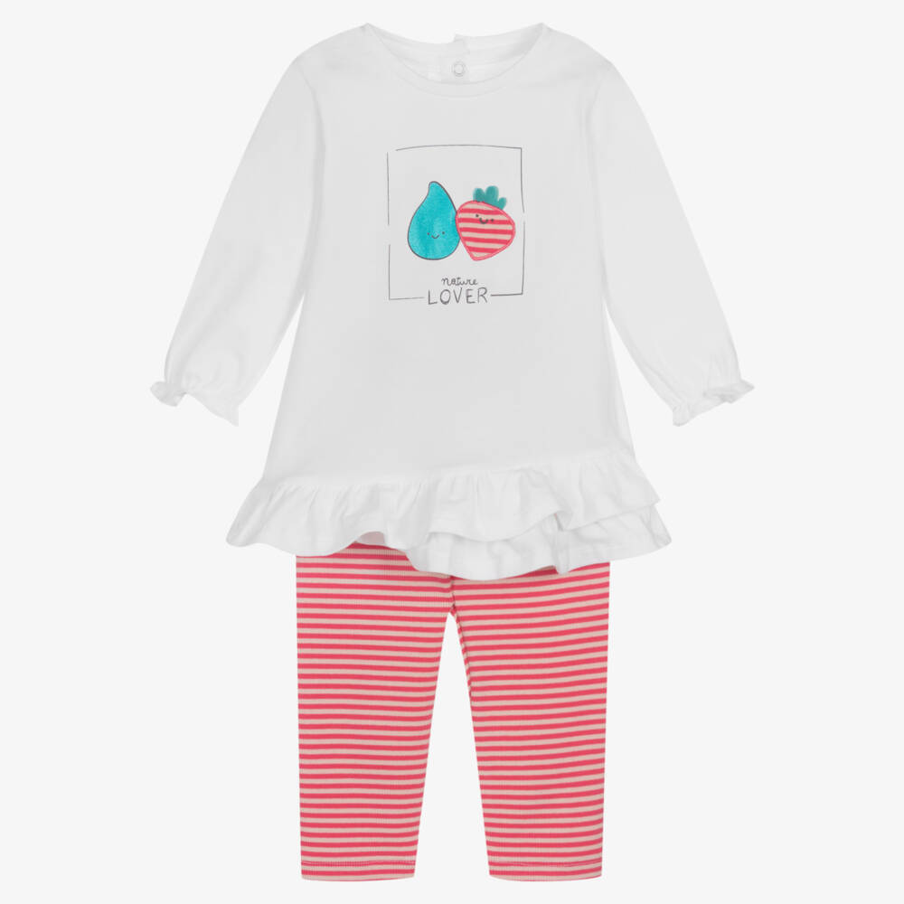 Cute cotton leggings set for baby girls by Italian brand iDO Mini, made in comfortable jersey and ideal for casual days. The white top has a cute fruit appliqué and print, with the words 'Nature Lover' below. It has gently elasticated, frilled cuffs, ruffles around the hemline and popper fastenings on the back. The full-length, ribbed leggings have contrasting pink stripes and a stretchy waistband.