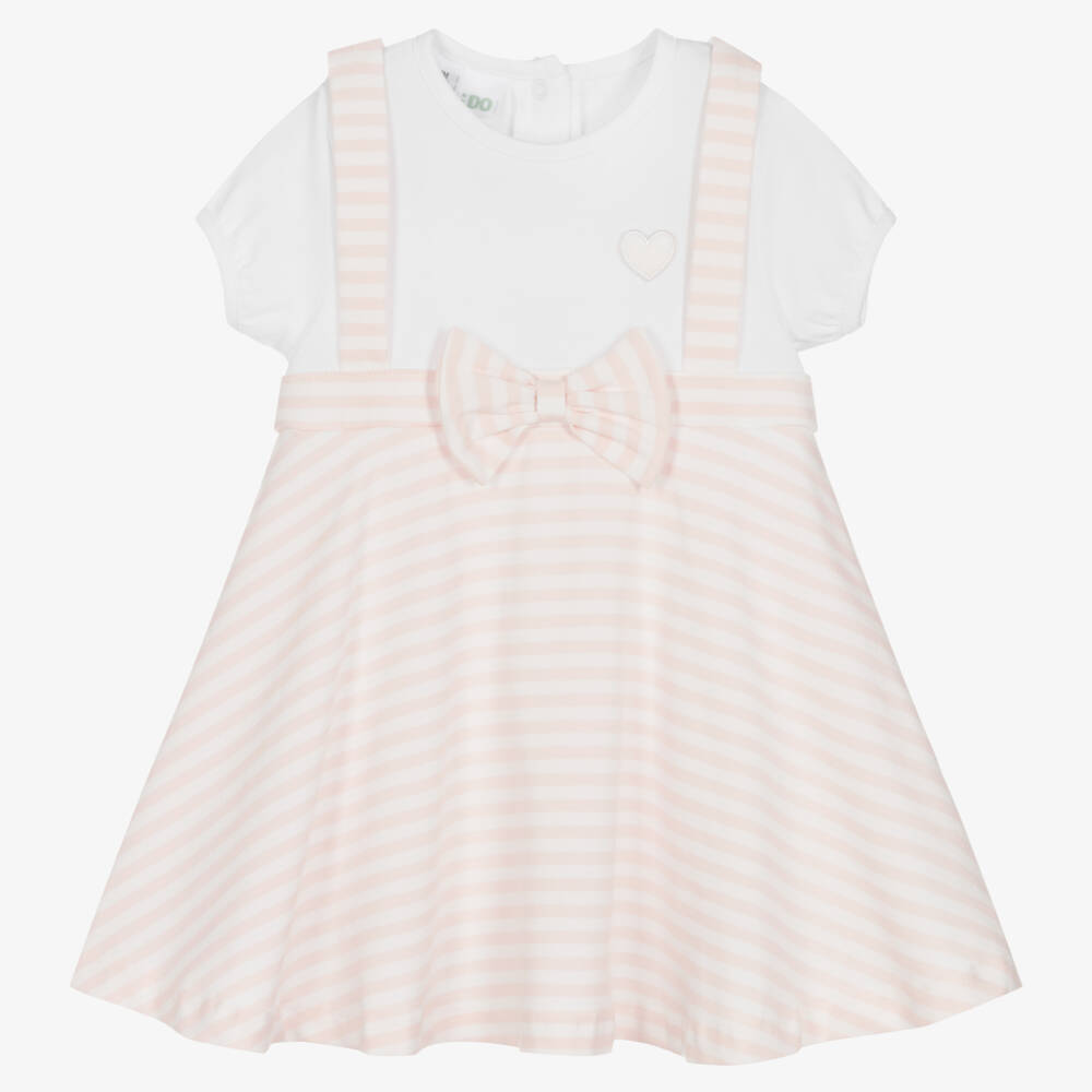 Baby girls white and pink striped dress by iDO Mini, made in soft cotton jersey. This cute one-piece has an attached bodysuit with poppers and a dress overlay.
