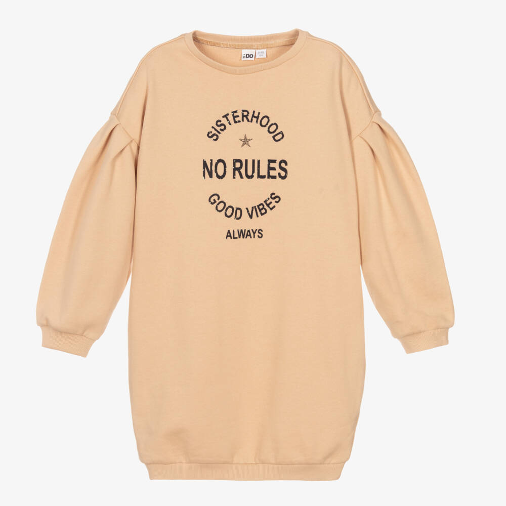Beige sweatshirt dress for girls by American brand iDO Junior, made in soft, lightweight cotton sweatshirt jersey with ribbed trims. It has black flocked slogans on the front, sparkling with silver glitter and an embroidered shiny gold star. The full, drop-shouldered sleeves have pretty pleats at the top.