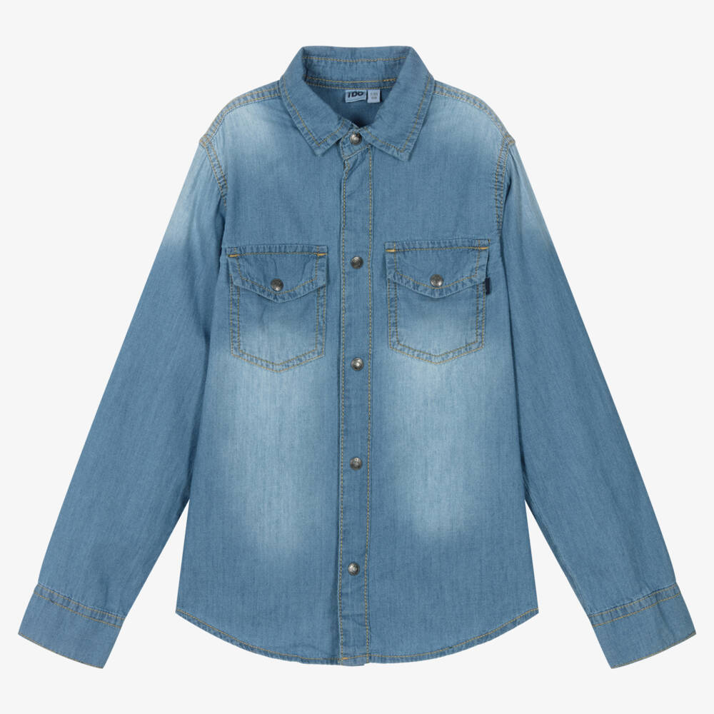 A versatile shirt for older boys and girls by iDO Junior, designed in a light blue wash. Made in soft cotton chambray, this easy-to-wear piece has a collared neckline, front popper fastenings and yellow topstitched seams. Flap pockets on the chest and a curved hemline add a neat finish.