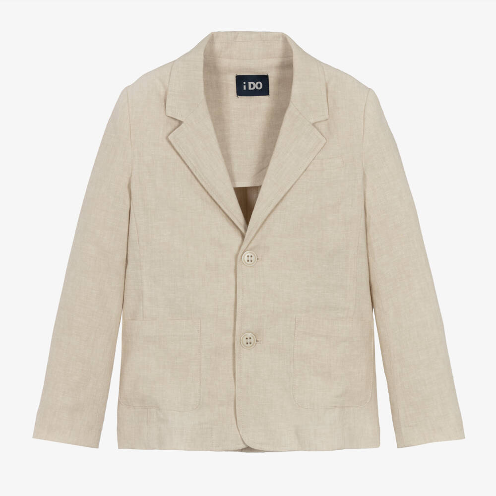 Smart-casual beige blazer for boys by iDO Baby, made in a cool, lightweight linen and viscose blend. There are useful patch pockets and a chest pocket on the front, with button fastenings. Ideal for warm days, it is only lined across the shoulders and sleeves and has a vent around the back for comfort.
