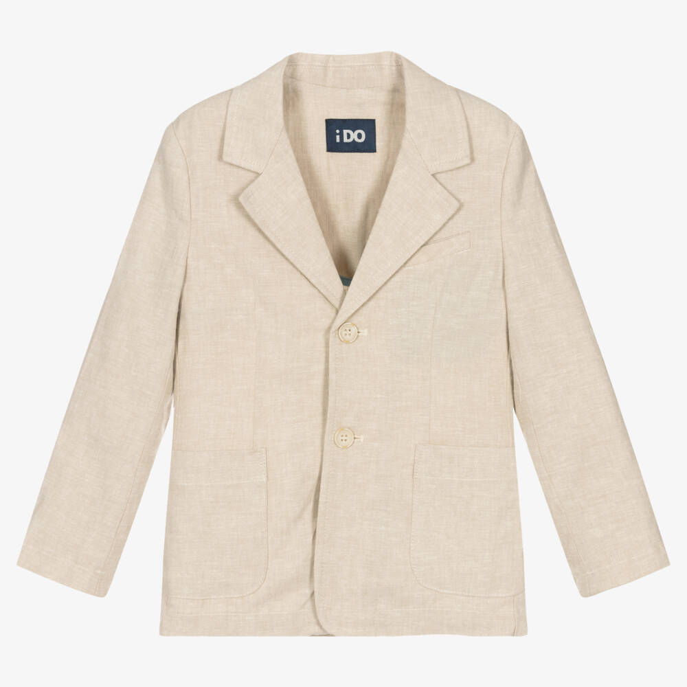 Smart-casual beige jacket for boys by iDO, made in a soft linen and viscose blend. Comfortable and lightweight, the blazer fastens with buttons down the front and has two front pockets, with a small chest pocket. For comfort, there is a linen lining on the shoulders and a silky lining in the sleeves.