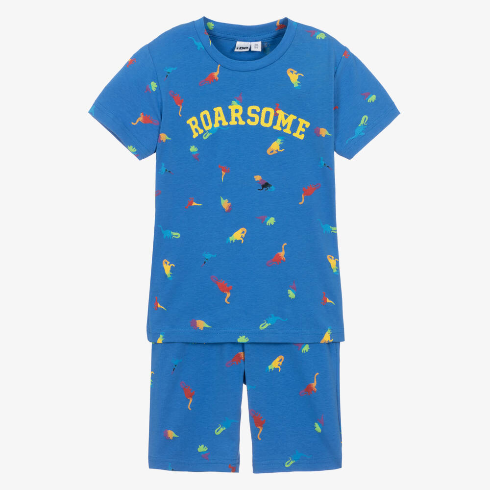 Blue short pyjamas for boys by iDO Baby, made in soft and stretchy cotton jersey. These cool pyjamas have a colourful all over dinosaur pattern and the word 'Roarsome' printed in bright yellow across the front of the top. The shorts have an elasticated waistband for a comfortable fit.