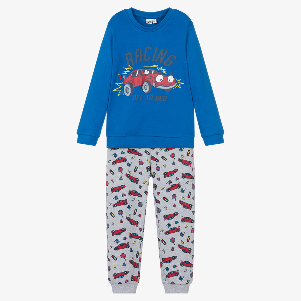 Cool blue and grey pyjamas for boys by iDO Baby, made in soft cotton jersey. The long-sleeved top is printed with a cartoon racing car, alongside the slogan 'racing off to bed'. The trousers are patterned with red cars, stop signs, and traffic lights to complement the top, and have an elasticated waist for additional comfort.