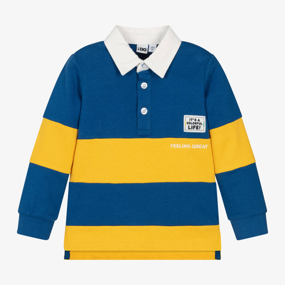 Casual blue and yellow striped rugby shirt for boys by Italian brand iDO Baby, with positive slogans on the front. Ideal for relaxed days, it is made in comfortable cotton jersey, with neat, ribbed cuffs on the long sleeves and a hemline that is longer around the back than the front. It has a white twill collar and branded button fastenings on the front.