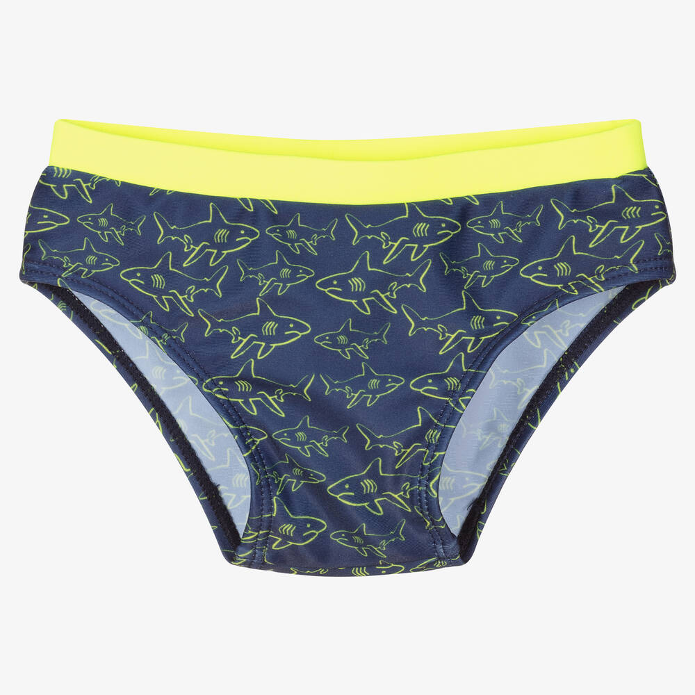 Navy blue swim trunks for boys by iDO Baby, with a neon yellow shark pattern. Silky soft and stretchy, it has a neon yellow elasticated waistband.