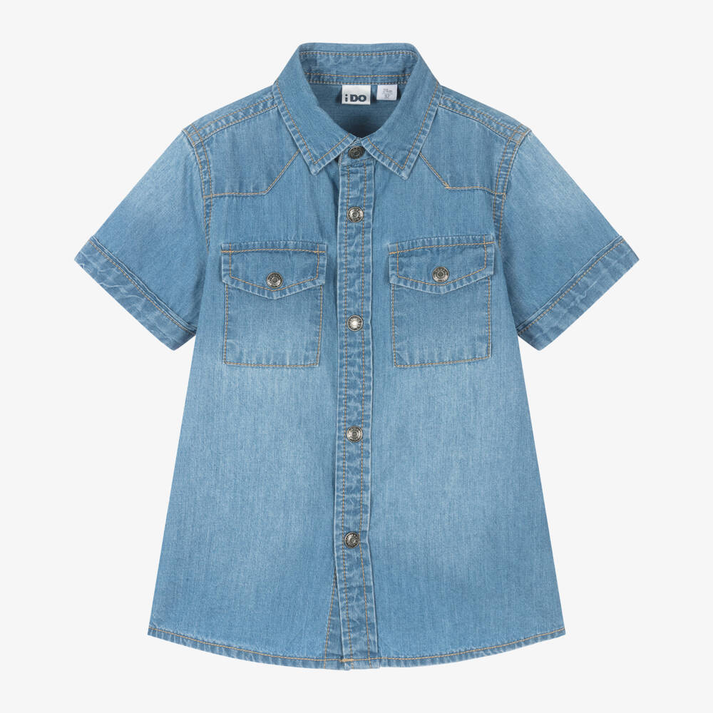 Blue wash shirt for boys by iDO Baby, made in soft cotton chambray for easy wear. Closely resembling denim, this lightweight top has short sleeves and branded popper fastenings on the front. There are two flap pockets on the chest and contrast stitching on the seams.