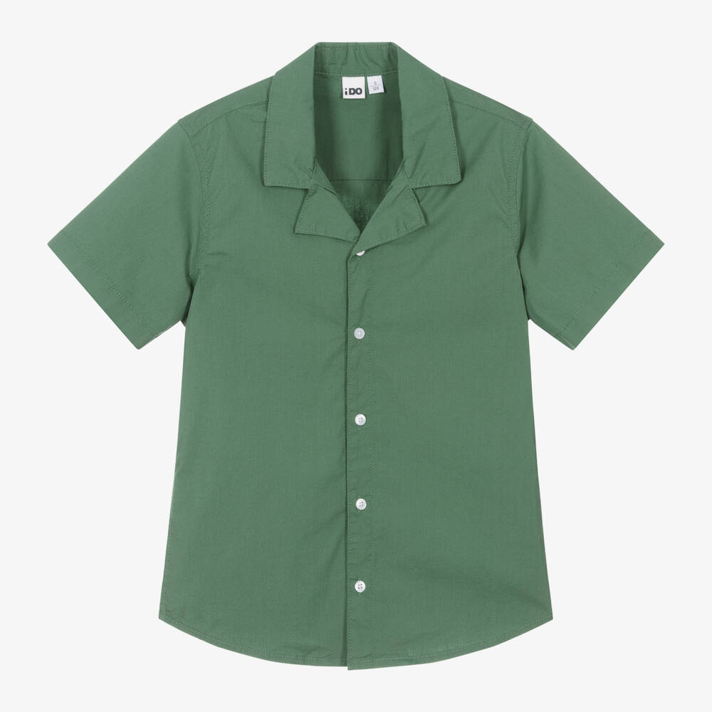 Casual green cotton shirt for boys by Italian brand iDO Junior, with a revere collar and short sleeves. It is made in stretch cotton poplin and fastens with white branded buttons on the front.