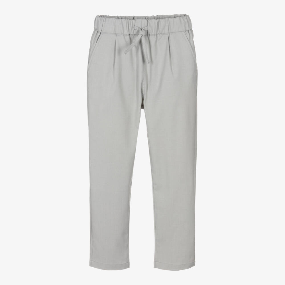 Pale grey trousers for boys by iDO, made in a soft viscose blend. They have a carrot fit with a useful, adjustable and drawstring waistband for comfort. They have slanted front pockets, with another pocket around the back.