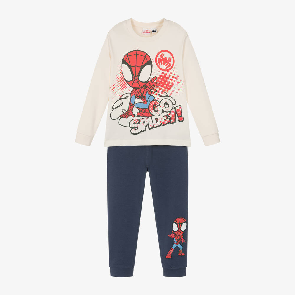 Ivory and blue pyjamas for younger boys by iDO Baby, made in soft cotton jersey for comfort all night long. For fans of Marvel, the long-sleeved top has a fun print of Spidey on the front with a bold graphic slogan below. The matching pyjama bottoms have an elasticated waistband and gently ribbed cuffs.