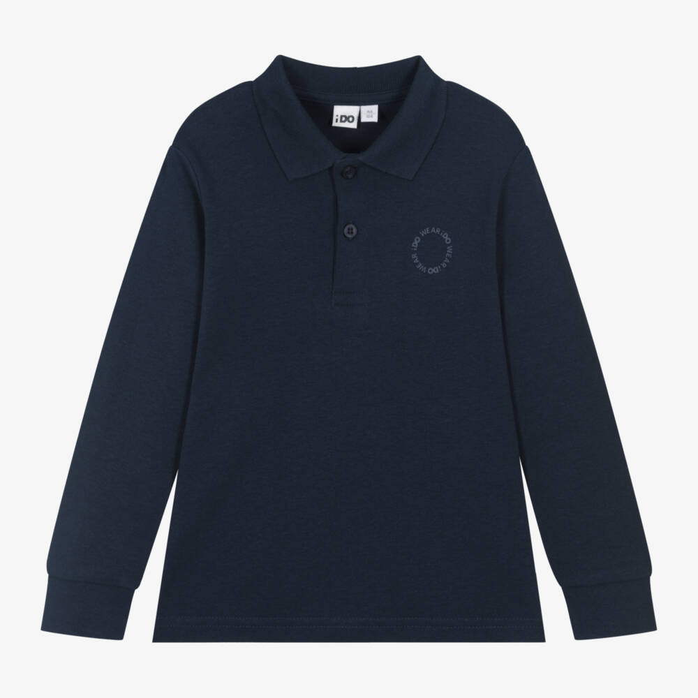 Casual navy blue rugby shirt for boys by Italian brand iDO Baby, made in soft cotton jersey. This wardrobe staple has ribbed cuffs on the long sleeves and a hemline that is longer around the back than the front. A tonal slogan on the chest and branded button fastenings on the front add a subtle designer finish.