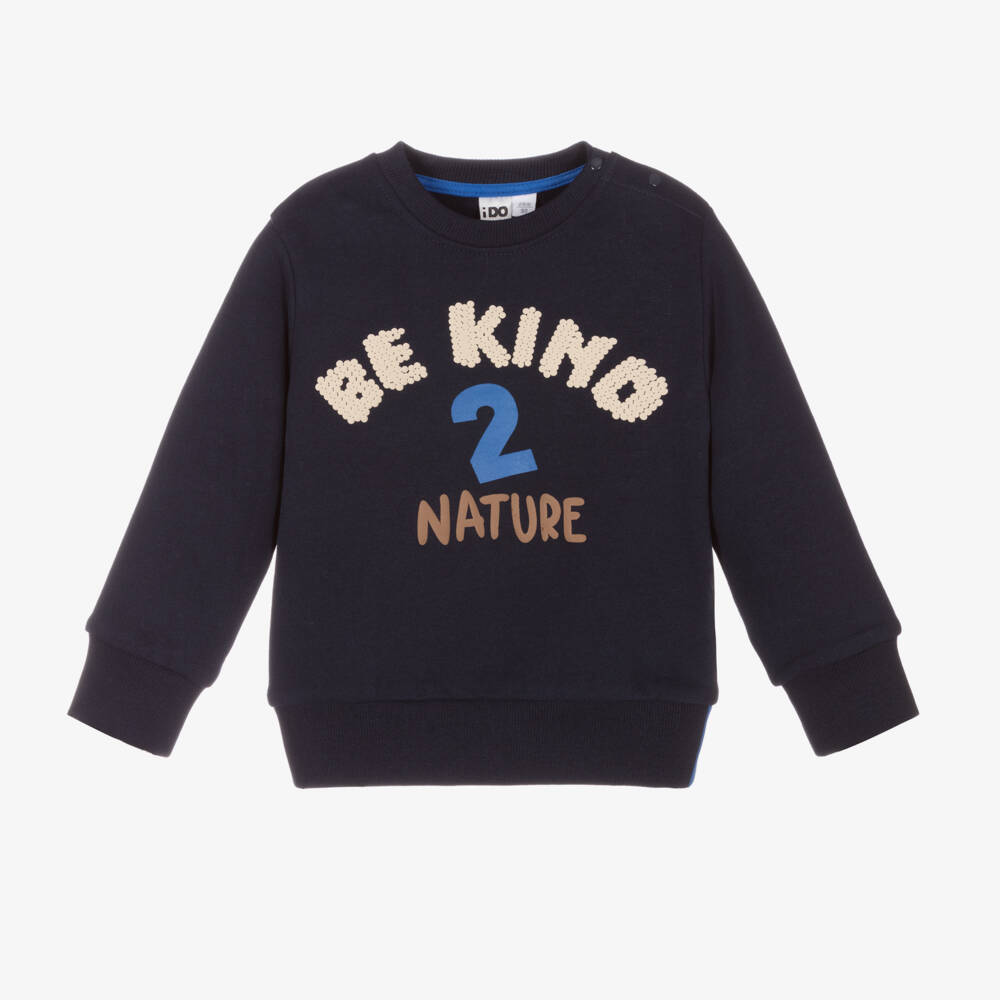 Lovely navy blue sweatshirt for boys by iDO Baby, made in soft cotton jersey, with a fleecy inside. Fastening with shoulder poppers on smaller sizes, it has a tonal beige and blue slogan print on the front.