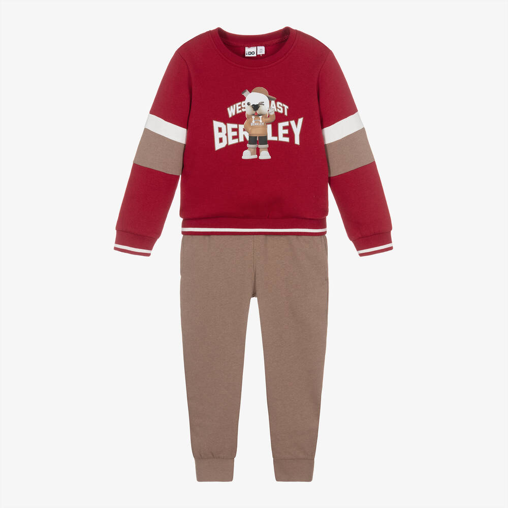A red and beige tracksuit for boys by iDO Baby, made from soft cotton-blend jersey with a cosy fleecy inside. The long-sleeved sweatshirt is printed with a cool dog design and varsity-style lettering on the chest, with striped sleeves for a sporty, casual look. Smaller sizes have poppers on one shoulder to make dressing easier. The coordinating joggers have useful side seam pockets and an elasticated drawstring waist for comfort.
