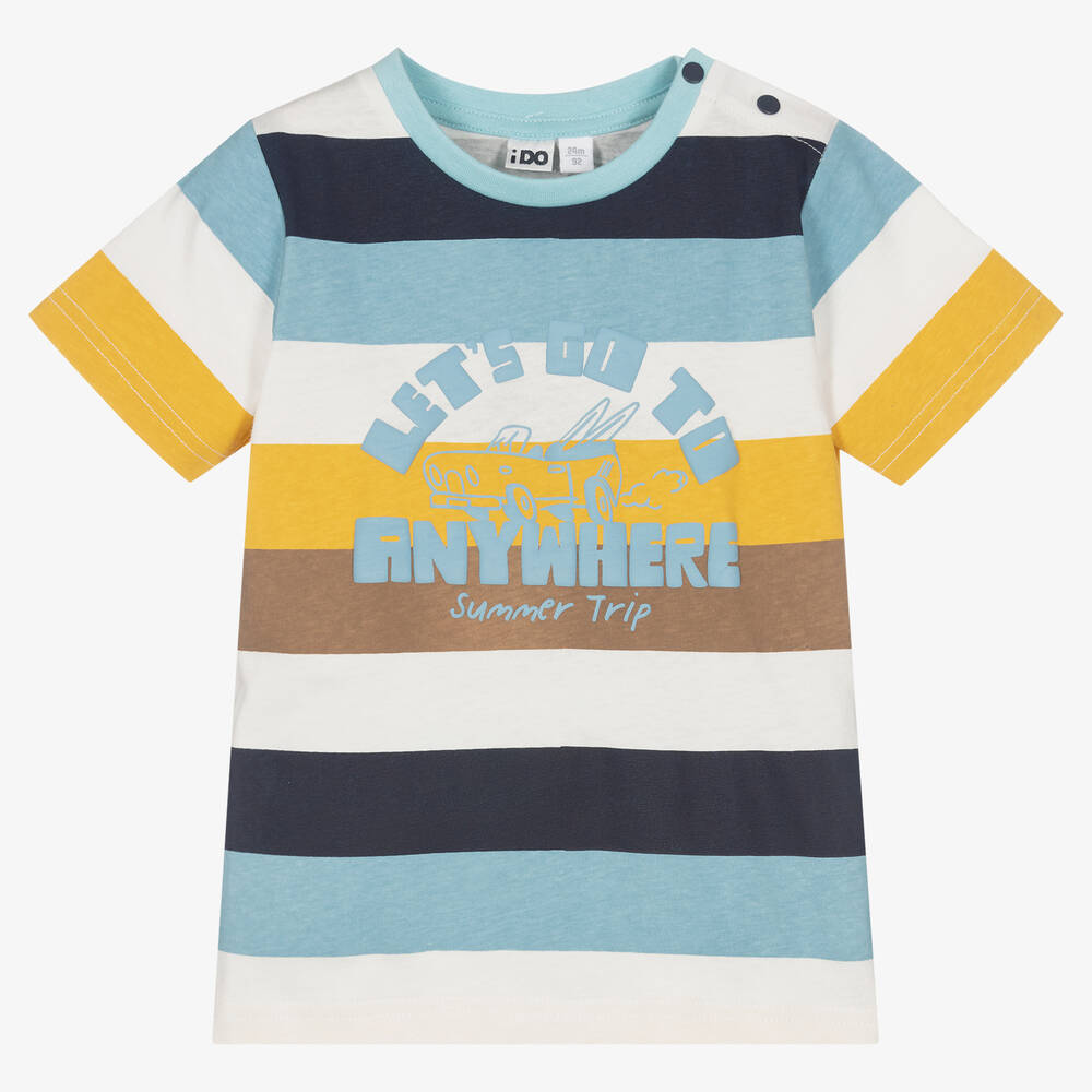 Casual blue, yellow and white striped T-shirt for boys is by iDO Baby. Made in soft and comfy cotton jersey, it has a fun slogan print on the front, with easy-fastening shoulder poppers on the smaller sizes.