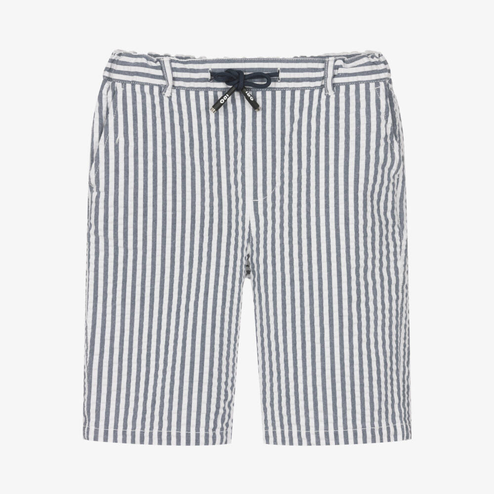 Casual blue and white striped shorts for boys by iDO Junior. Made in lightweight cotton seersucker, they are easy and comfortable to wear. They have useful back and front pockets, with an elasticated drawstring waist that can further be adjusted internally.