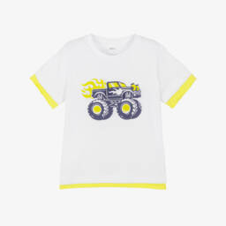 White T-shirt for boys by iDO, made in soft cotton jersey. Casual and comfortable, it has a fun blue monster truck print on the front with an interactive flap lifting to reveal the word 'Vrooom'. There is a blue slogan on the back and acid yellow trims for a pop of colour.