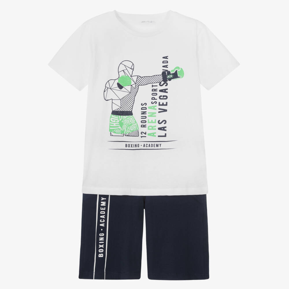 White and navy blue shorts set for boys by iDO Junior, made in soft and stretchy cotton jersey. The white T-shirt has a navy blue and green boxing themed print on the front. The navy blue Bermuda length shorts have a white 'Boxing Academy' print on one leg and front pockets. The ribbed waistband has a useful internal drawstring for a comfortable fit.